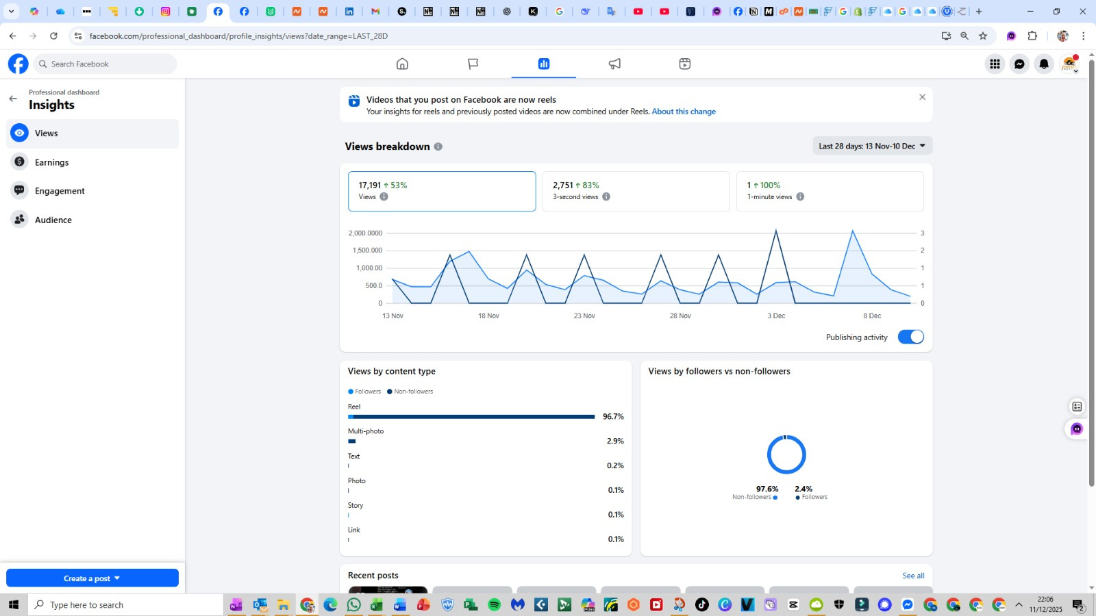 See this recent Facebook Insights for Ovaall Roofing showing 17,191 views in 1 month in November 25